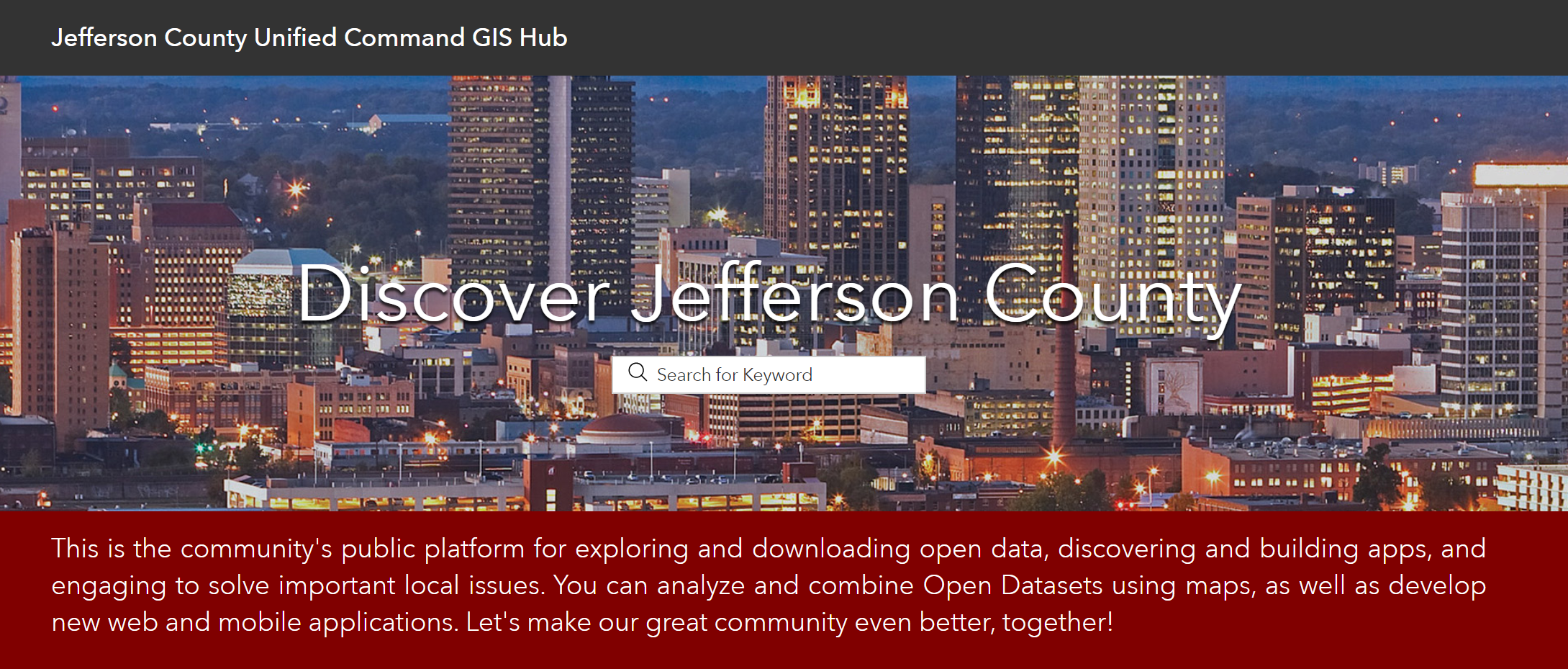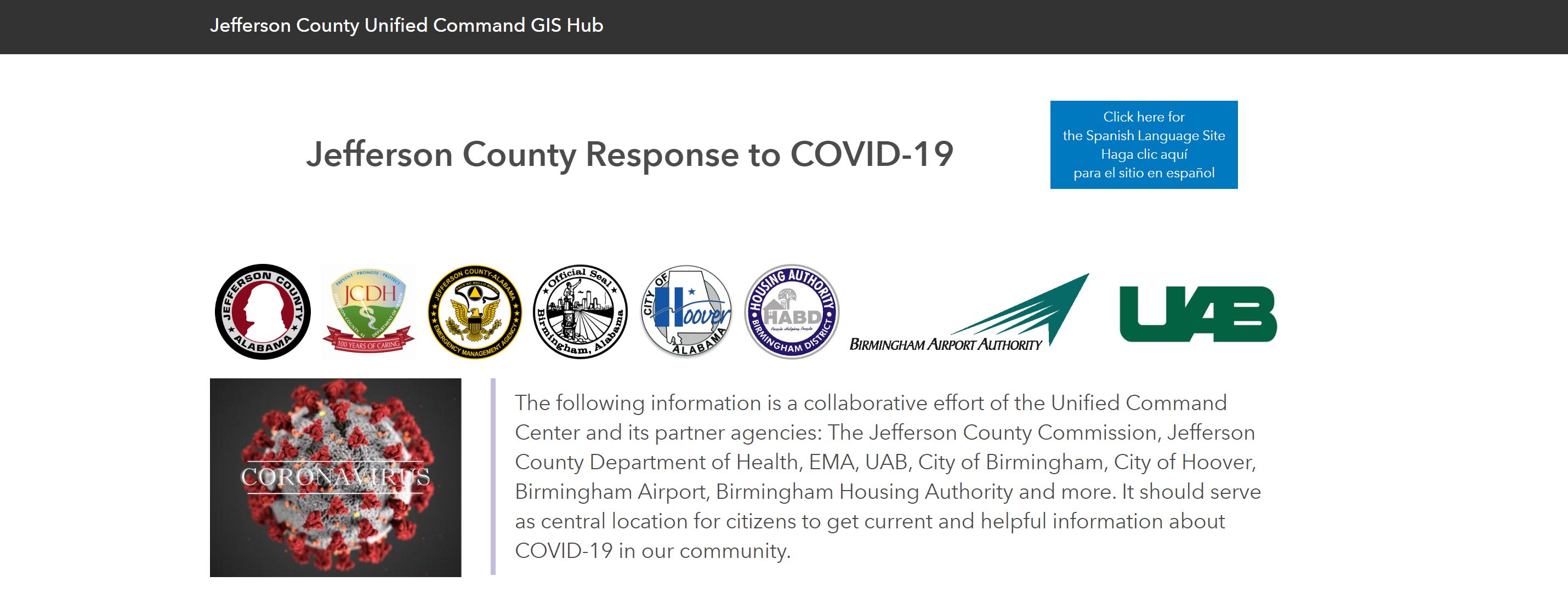 One of our newest GIS developments has been the COVID-19 page that is the primary communication platform for data about COVID-19 in Jefferson County. This page contains information collected as a collaborative effort of the Unified Command Center and its partner agencies: The Jefferson County Commission, Jefferson County Department of Health, EMA, UAB, City of Birmingham, City of Hoover, Birmingham Airport, Birmingham Housing Authority and more. It should serve as central location for citizens to get current and helpful information about COVID-19 in our community.