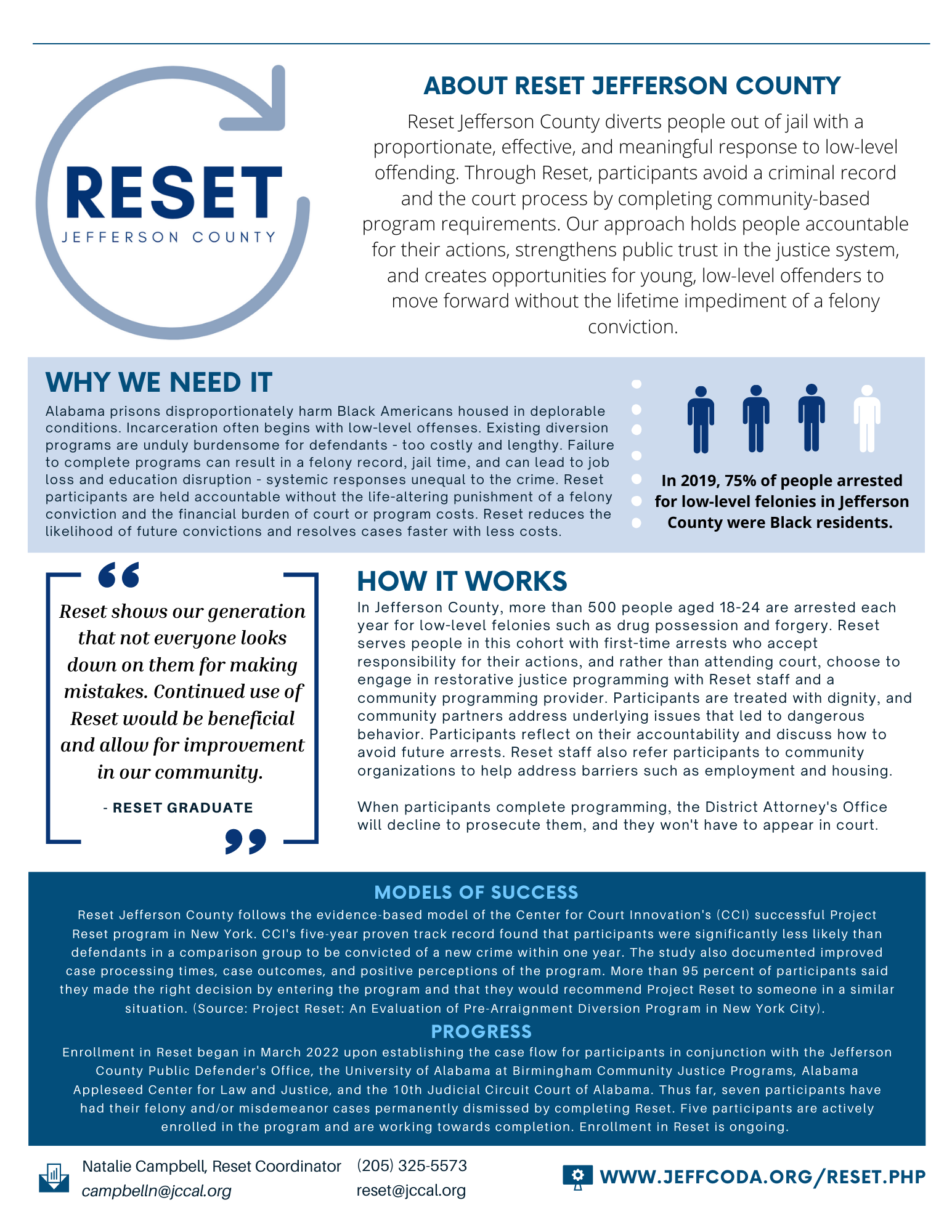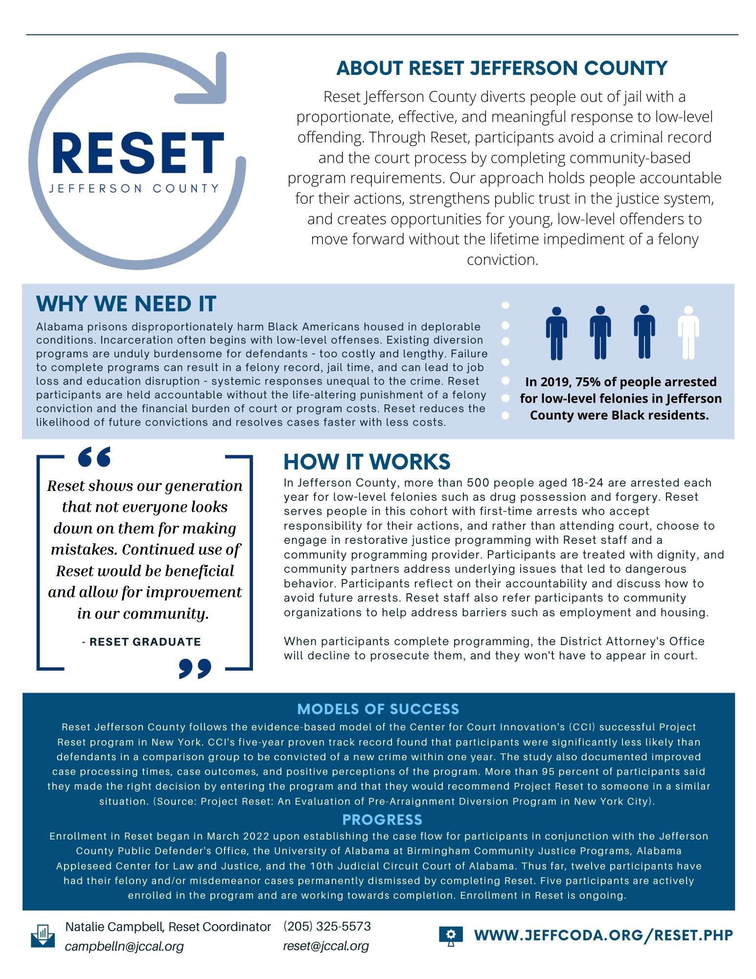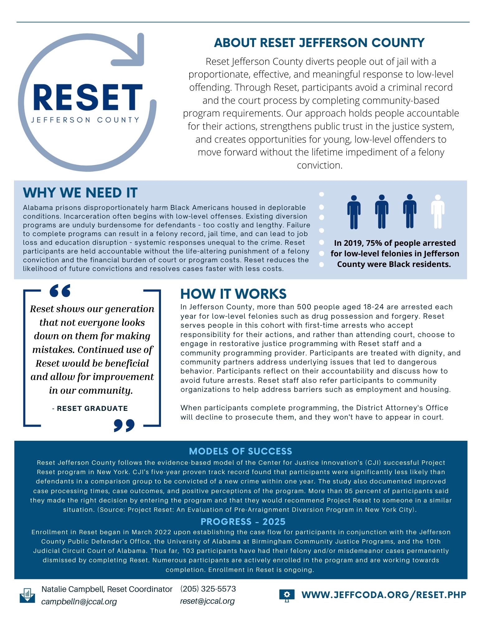 Alabama prisons disproportionately harm Black Alabamians housed in deplorable conditions. Incarceration often begins with low-level offenses. Existing diversion programs are unduly burdensome for defendants-too costly and lengthy. Failure to complete programs results in a felony record, jail time, and can lead to job loss and education disruption - systemic responses unequal to the crime. Reset participants are held accountable without the life-altering punishment of a felony conviction and the financial burden of court or program costs. The program reduces the likelihood of future convictions and resolves cases faster, with less costs. Reset is meaningful justice reform for disproportionately impacted people of color.