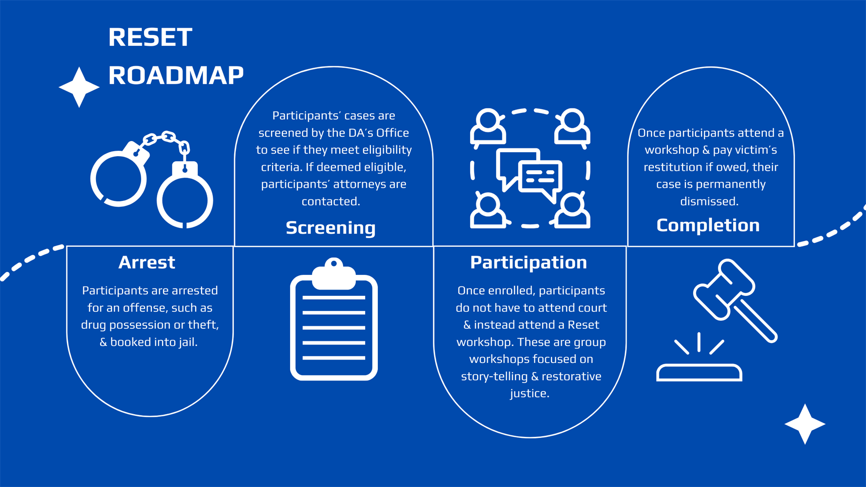In Jefferson County, more than 500 people aged 18-24 are arrested each year for low-level felonies, such as drug possession and forgery. In 2019, 75% of people arrested were Black residents, a significantly disproportionate number. Reset serves people in this cohort with first-time arrests who accept responsibility for their actions, and rather than attending court, choose to engage in restorative justice programming with Reset staff and a community provider. Participants are treated with dignity, and community partners address underlying issues that led to dangerous behavior. Participants reflect on their accountability and discuss how to avoid future arrests. Reset staff also refer participants to community organizations to help address barriers such as employment and housing.